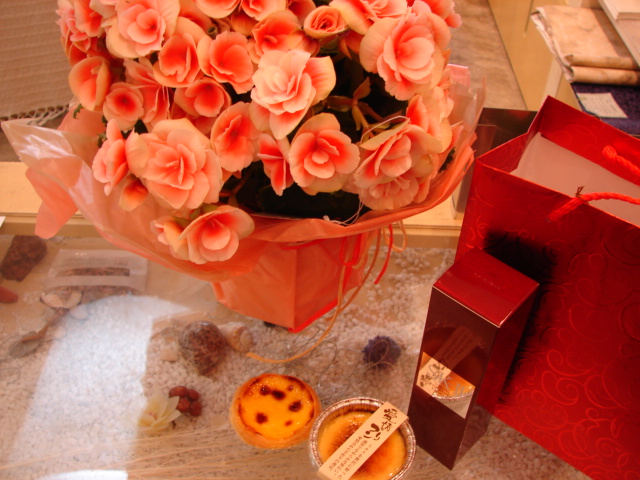 鉢植えのお花、某メーカーの化粧水SK〇、プリン(愛情プリン)